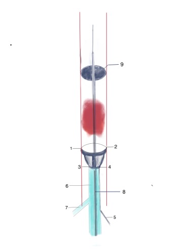 本发明利用现在已有取栓导管球囊,进行整合设计,第一可以避免病人开刀,可全程微创下做完手术;利用目前已有的耗材,一是可以降低操作难度、学习时间较短;二是可大大减少医耗材成本;第三简化结构,将支撑杆、鞘、可调节囊体结构整合在一起。